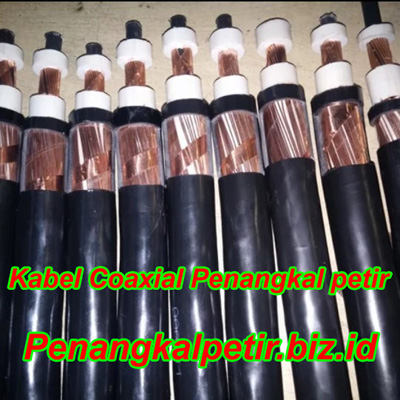 Kabel coaxial penangkal petir juga termasuk jenis kabel penghantar penurunan dari sistem instalasi penangkal petir. Karakteristik kabel coaxial ialah memiliki banyak isolator, konduktor inti kabel coaxial terdapat dua buah yang masing-masing memiliki luas penampang 35 mm. Karakter kabel coaxial sama seperti kabel NYFGbY, yang dimana terdapat suatu rangkaian isolator yang terdiri dari banyak material yang menjadi satu kesatuan. Isolator pada kabel berfungsi melindungi dari induksi dan loncatan arus antara inti kabel dengan material lain dengan sifat konduktor (penghantar). Untuk ukuran kabel coaxial pada umumnya 2 x 35 mm. Kabel ini termasuk jenis kabel penghantar penurunan dengan spesifikasi yang tinggi, serta kualitasnya terbaik diantara jenis kabel penghantar penurunan lainnya. Merk kabel coaxial seperti kabel coaxial DCE, kabel coaxial liteco, kabel coaxial ericore – ERICO yang banyak di jual dipasaran.